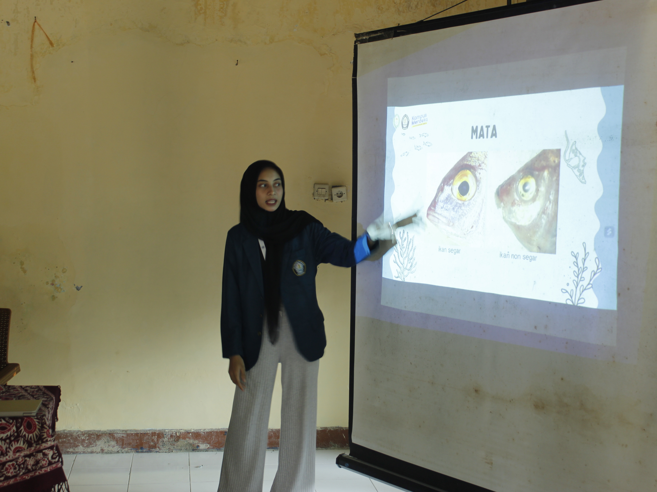 Gambar 1. Pemaparan materi cara membedakan ikan segar dan kurang segar serta bagaimana cara memperlambat pembusukan pada ikan